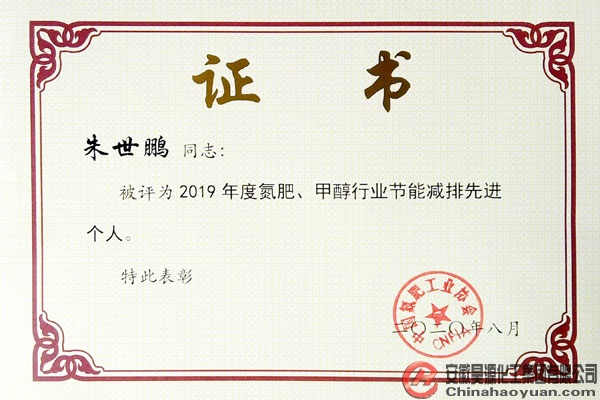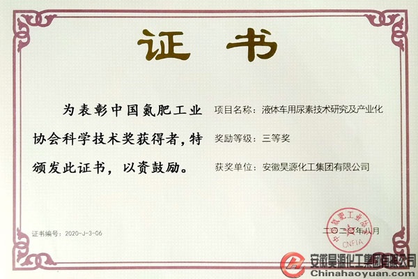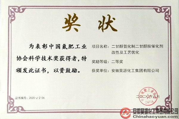 會上,昊源公司被評為“2019年度氮肥、甲醇行業節能減排先進單位”,公司的“二甘醇氨化制二甘醇胺工藝優化與提升”和“低能耗濃鹽水分質結晶零排放裝置研發及產業化”項目榮獲中國氮肥工業協會科學技術獎二等獎,“液體車用尿素技術研究及產業化”和“粗甲醇分離純化新工藝的開發與研究”項目榮獲中國氮肥工業協會科學技術獎三等獎,張超、朱世朋被評為“2019年度氮肥、甲醇行業節能減排先進個人”。