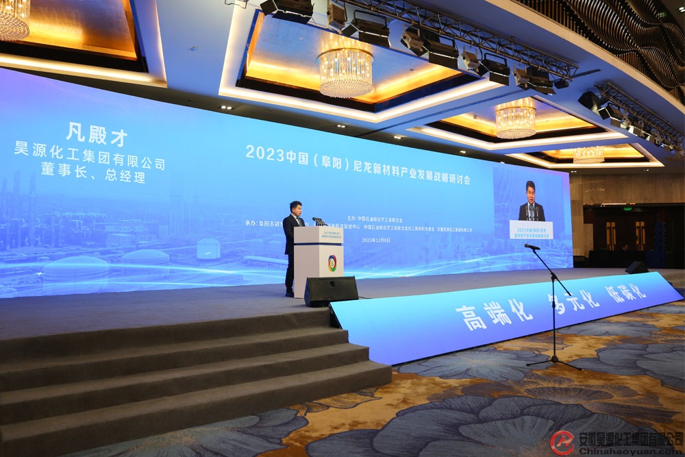 12月8日,由中國石油和化學工業聯合會主辦,阜陽市潁東區人民政府、阜陽市招商投資促進中心、中國石油和化學工業聯合會專委會、安徽昊源化工集團有限公司承辦的“2023中國(阜陽)尼龍新材料產業發展戰略研討會”在阜陽天筑豪生大酒店舉行。昊源公司黨委書記、董事長凡殿才出席會議并與會發言。