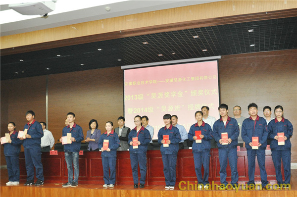 10月23日,安徽職業技術學院2013級“昊源獎學金” 頒獎儀式暨2014級“昊源班” 授牌儀式在安徽職業技術學院圖書館三樓報告廳隆重舉行。公司副總經理楊捷、企管處處長張明、擴建辦副主任沈獻、安徽職業技術學院院長亓四華、副院長史鋒、化學工程系主任方向紅等出席頒獎授牌儀式。