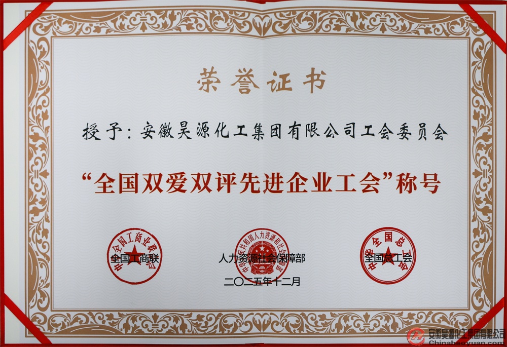 近日,全國工商聯、人力資源和社會保障部、全國總工會聯合發文表彰先進,安徽昊源化工集團有限公司工會委員會成功入選全國“雙愛雙評”先進企業工會,系全省唯一獲此殊榮的單位。