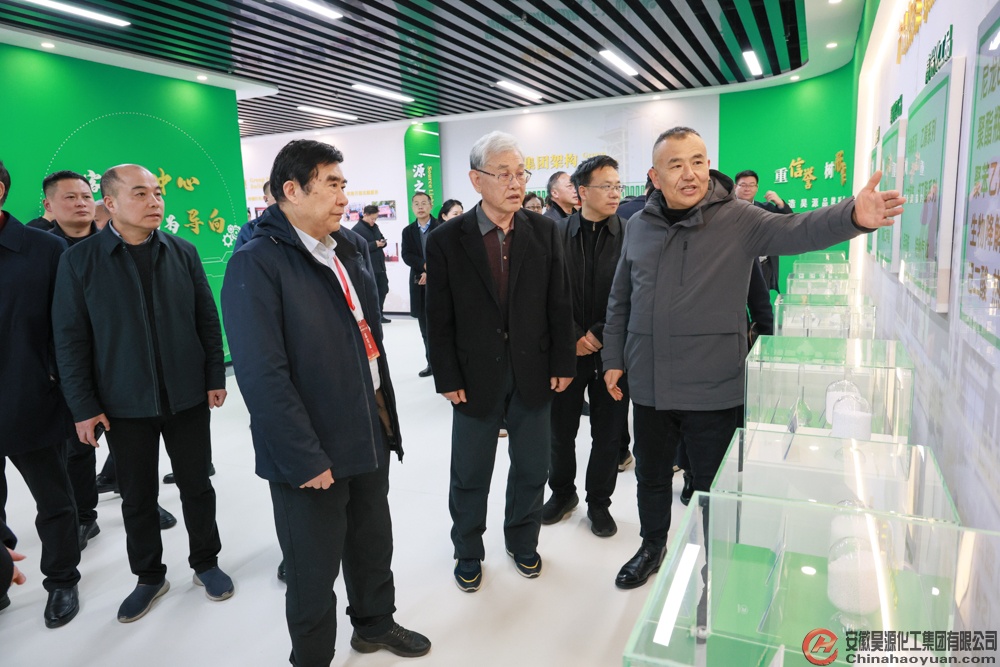 考察團一行首先來到昊源研發中心展廳,通過歷史影像資料、詳實的圖文展板及公司主要產品實物陳列,了解昊源公司從傳統煤化工起步,堅定邁向高端化、低碳化發展的戰略轉型之路,對昊源公司精準謀劃、科學發展表示贊賞。