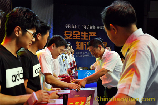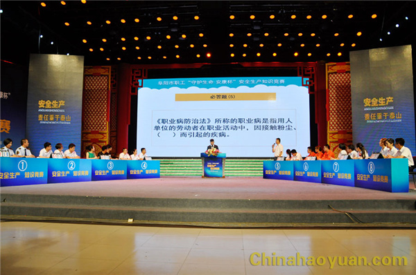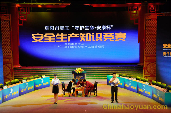 6月27日下午,由阜陽市總工會、阜陽市安監總局聯合舉辦的阜陽市職工“守護生命.安康杯”安全知識競賽在阜陽市電視臺一號演播大廳舉行,昊源集團代表隊從全市18支代表隊脫穎而出進入決賽。 比賽分為演講表演和知識競賽兩個部分,,比賽現場氣氛熱烈,觀眾情緒高漲,選手們你追我趕,經過激烈角逐,昊源公司代表隊獲得第三名的好成績。