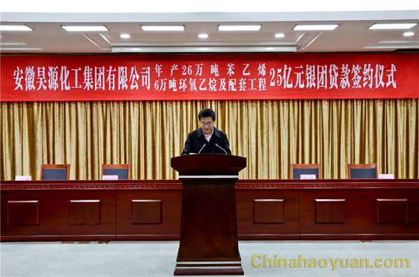 2017年1月6日上午,安徽昊源化工集團有限公司年產26萬噸苯乙烯、6萬噸環氧乙烷及配套工程項目25億元銀團貸款簽約儀式在阜陽市政府三樓會議室舉行。市委副書記,市政府代市長、黨組書記孫正東,市政府秘書長王顯義、副秘書長趙志賀、朱新,昊源公司黨委書記、董事長凡殿才,中國建設銀行安徽省分行、中國進出口銀行安徽省分行、中國光大銀行合肥分行、合肥科技農村商業銀行主要負責人出席簽約儀式。