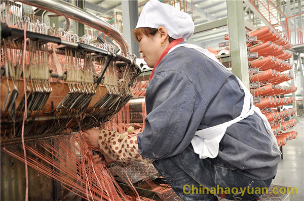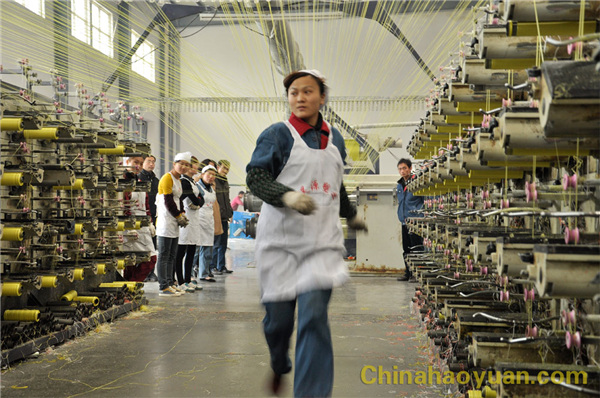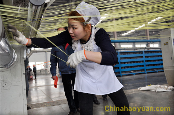 拉絲崗位女工快速地從牽伸輥上拉絲、掛絲