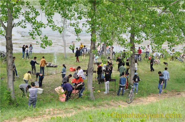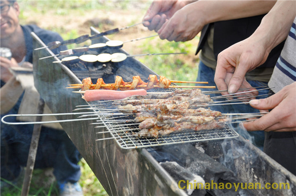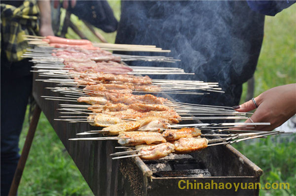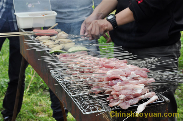 稍作休息,大家便開始了此次燒烤活動的準備工作,拾柴火、生爐子、串肉串,一片熱火朝天的忙碌景象。